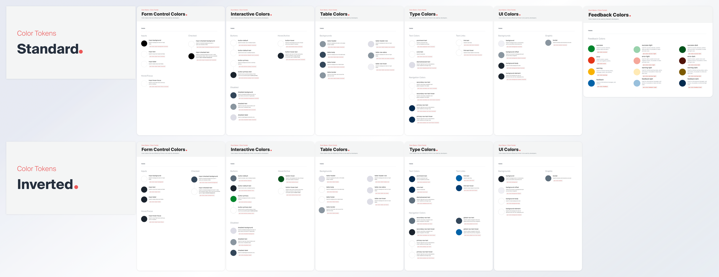 After designing the brand color identity, I created two sets of color tokens, standard and inverted. These also consisted of token groupings like form control, interactive, table, type, UI, and feedback colors.