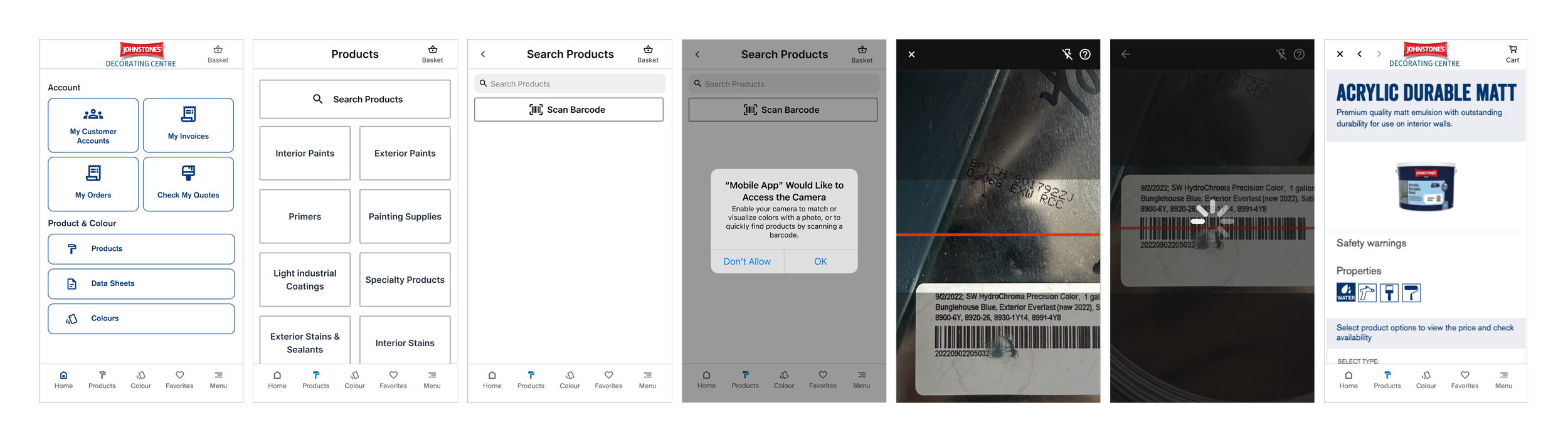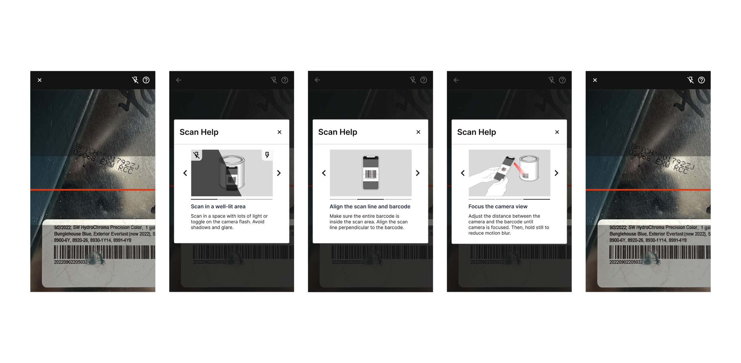 I drew inspiration from the Coloursmith and Johnstone’s MY colour user experiences when designing the barcode scanner help modal for the Pro platform apps. By referencing how our other apps effectively provided users with help tips through modals, I was able to ideate a clear and user-friendly help modal that enhances the overall scanning experience.
